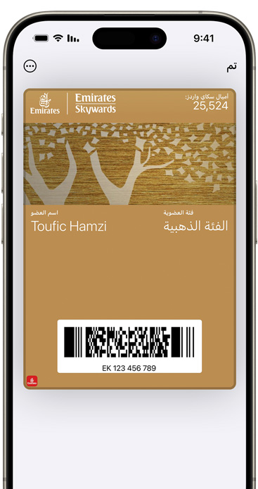 • Apple لا تشارك أرقام بطاقاتك الفعلية مع التجار ولا تخزَّن على سيرفراتها إطلاقاً، فمعلومات بطاقاتك تُربط بكل أمان بحساب Apple الخاص بك لمساعدتك على إضافة بطاقاتك وتذاكرك وإدارتها عبر مختلف أجهزتك.