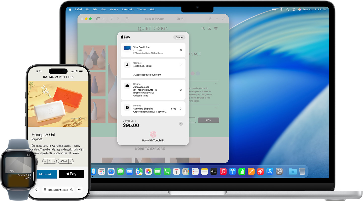 Apple Pay ist sicherer als Kredit‑, Debit‑ oder Prepaidkarten. Du brauchst Face ID, Touch ID oder deinen Code, wenn du mit deinem iPhone, Mac oder iPad oder deiner Apple Watch bezahlen möchtest. Deine Identität wird nicht mit Händlern geteilt, und sie sehen nicht deine eigentliche Kartennummer. Und deine Kartennummern werden niemals auf Apple Servern gespeichert.