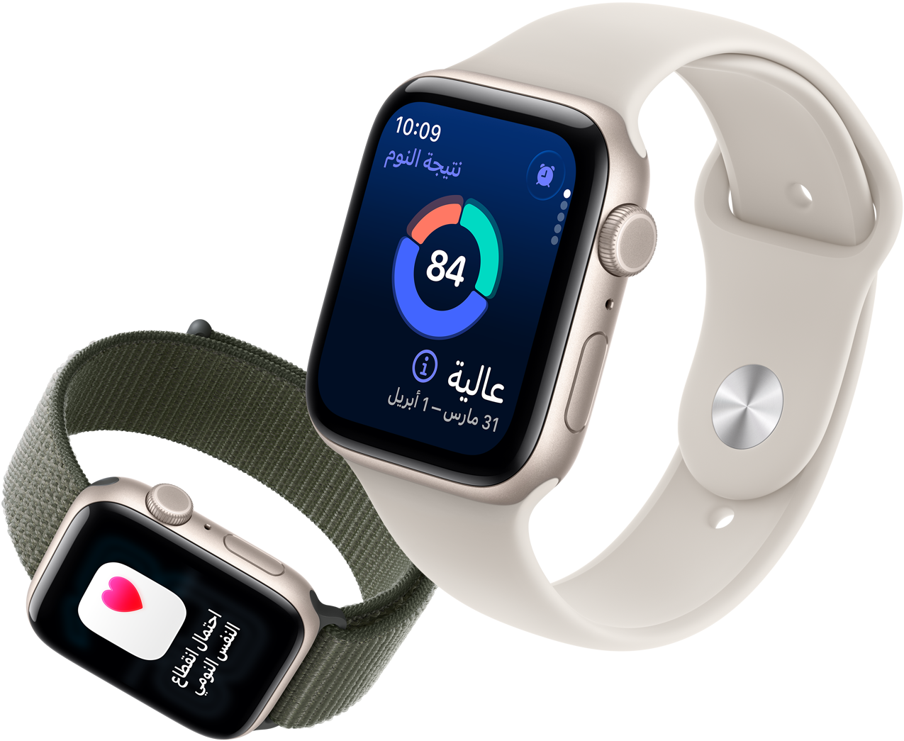 Apple Watch SE 3 بإطارات ألومنيوم متوفرة بلون ضوء النجوم وسماء الليل، تعرض تطبيقات مثل تطبيق العلامات الحيوية ومعدل نبض القلب وميزة نتيجة النوم وحلقات النشاط ومكالمة واردة
