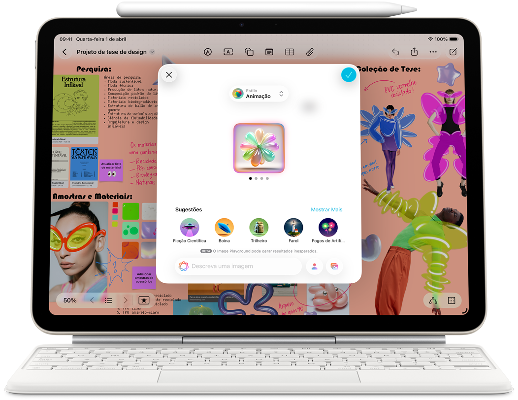A Apple Intelligence possibilita se expressar visualmente de um jeito divertido. Transforme um rascunho em uma imagem relacionada com a Varinha Gráfica. E, com o Image Playground, crie imagens únicas com base em descrições, sugestões de conceitos ou até em uma pessoa da sua Fototeca.