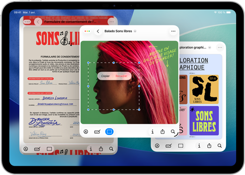 iPad, trois modèles, orientation paysage, le modèle du centre est à l’avant-plan, un Apple Pencil est fixé magnétiquement sur le dessus du modèle central, le modèle central affiche l’écran d’accueil qui montre des icônes d’apps colorées avec effet Liquid Glass, le modèle de gauche affiche l’app Aperçu, le modèle de droite affiche l’écran d’accueil avec des fichiers déployés en éventail à partir du Dock