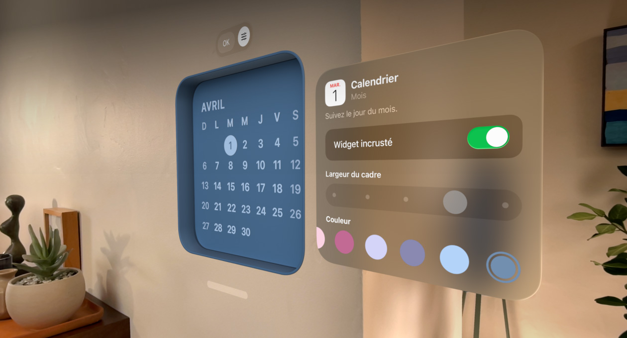 Gardez à portée de vue vos widgets préférés, comme Photos, Horloge, Musique et Calendrier. Et ajustez l’épaisseur de leur cadre, leur couleur ou leur profondeur pour retrouver un espace bien à vous chaque fois que vous enfilez votre Apple Vision Pro.