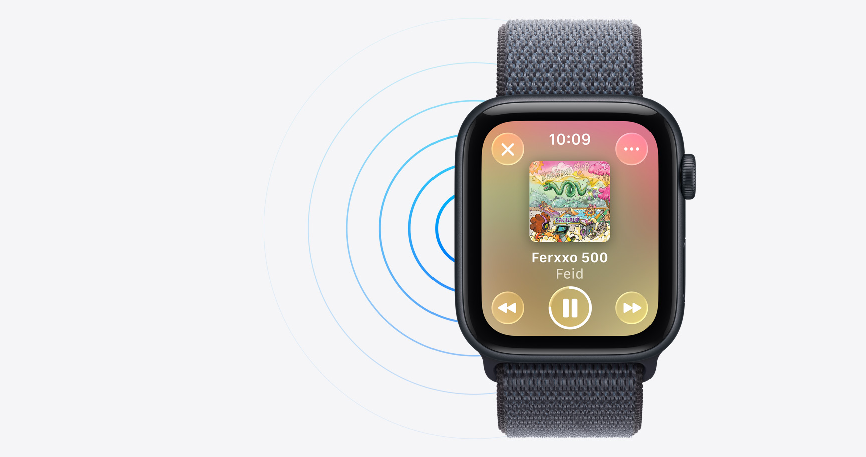El Apple Watch SE 3 se conecta fácilmente a tus AirPods para que escuches música, audiolibros o podcasts sin usar las manos.6 Y si no andas trayendo tus AirPods, puedes reproducir audio directamente desde el parlante de tu reloj.
