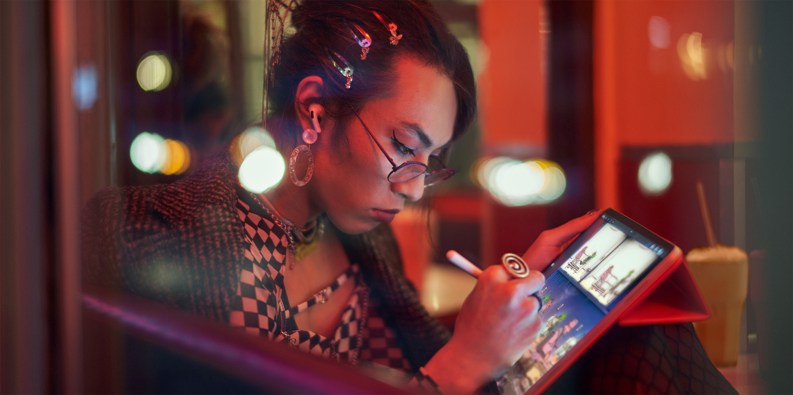 “Me gusta tener distintos tamaños de pantallas para cada nivel de interacción”, comenta Lim-Chan, que usa el MacBook con Photoshop para diseñar y el iPad con Procreate para ilustrar y hacer bocetos. “Y gracias a la velocidad de respuesta y comodidad del Apple Pencil, no extraño para nada el lápiz y el papel”.