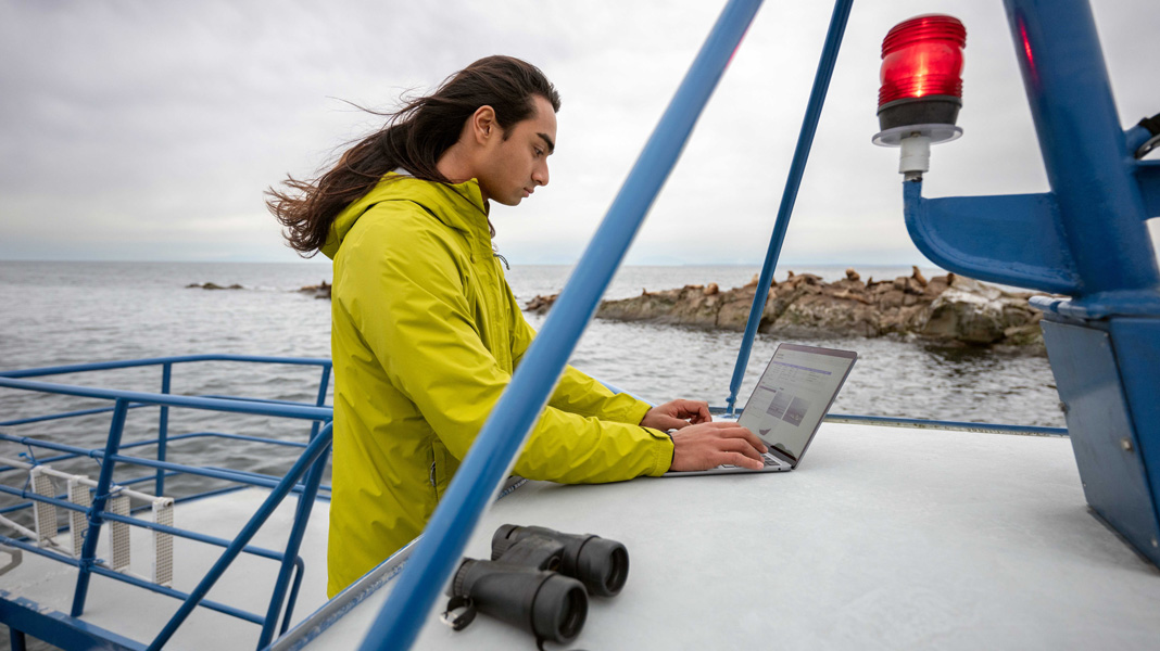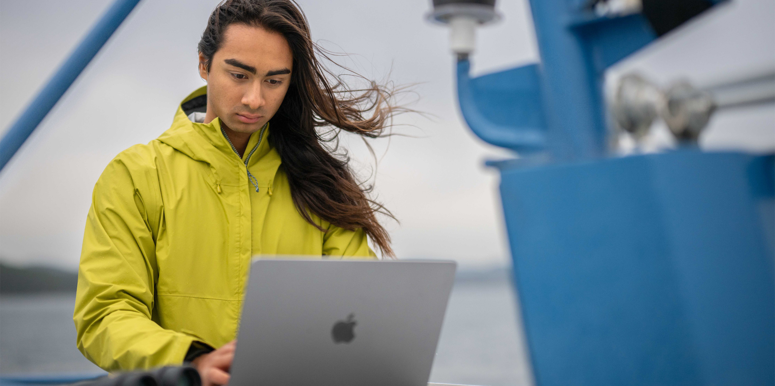 La tecnología de Apple también ayuda a Bodhi a realizar y sintetizar sus investigaciones universitarias, como ilustrar los impactos de las actividades de los buques marinos sobre la población de orcas residentes del sur, una especie en peligro de extinción presente en el mar de los Salish. Con el MacBook Air, el iPhone y unos binoculares, realiza todo el trabajo de campo mar adentro. Registra los avistamientos de ballenas en Numbers y Keynote para crear diagramas de flujo y mapas de densidad que muestran dónde se cruzan con las rutas populares de ferris, lo que ayuda a identificar posibles interferencias con las poblaciones de ballenas de la región. Y con el iPhone, toma fotos y graba videos para documentar todos sus hallazgos.