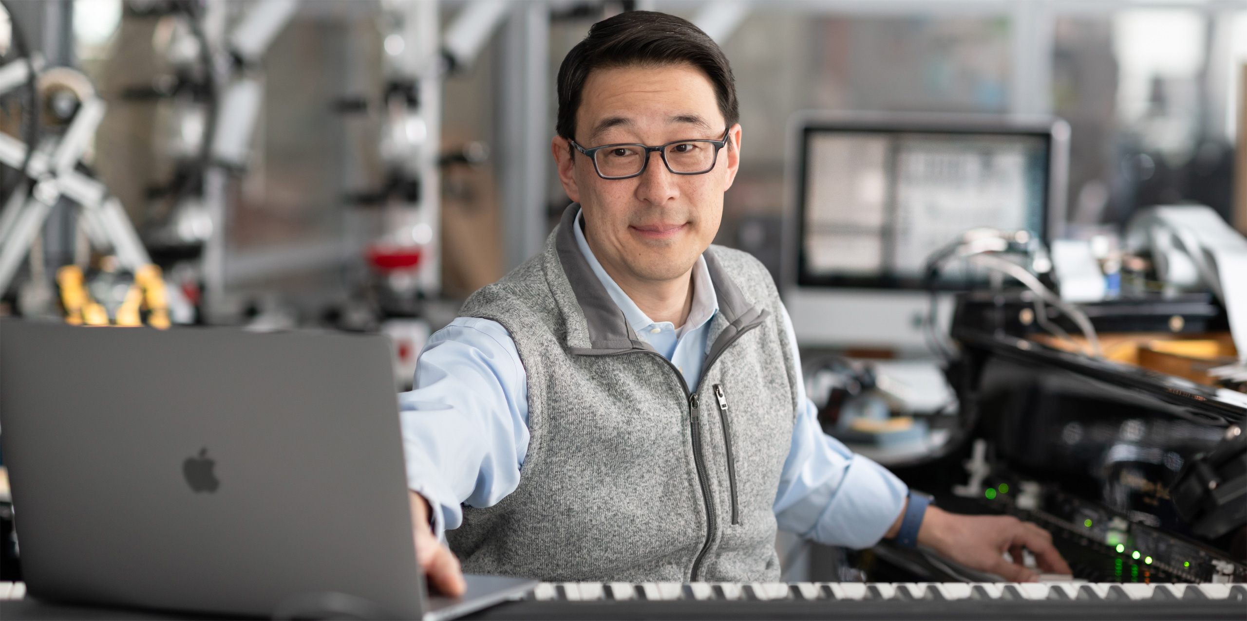 MacBook Pro. El Mac trabaja sin problemas con apps profesionales de música y visualización, como Logic Pro y MATLAB, y lleva a otro nivel la investigación en audición automatizada que el Dr. Kim realiza con instrumentos y robots creados por él mismo.