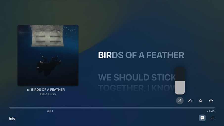 Apple Music. Pouštěj si přes 100 miliónů skladeb, 30 000 playlistů a živá rádia na velké obrazovce. Nebo se staň hvězdou a podle textů zobrazovaných v reálném čase si zazpívej hitovky s Apple Music Sing.⁶ Vokály si můžeš přizpůsobit podle sebe a zpívat hlavní hlas, pustit se do duetu nebo broukat doprovodné melodie. A když budeš chtít, aby tvůj hlas zazněl přímo z televize, můžeš použít iPhone jako mikrofon.