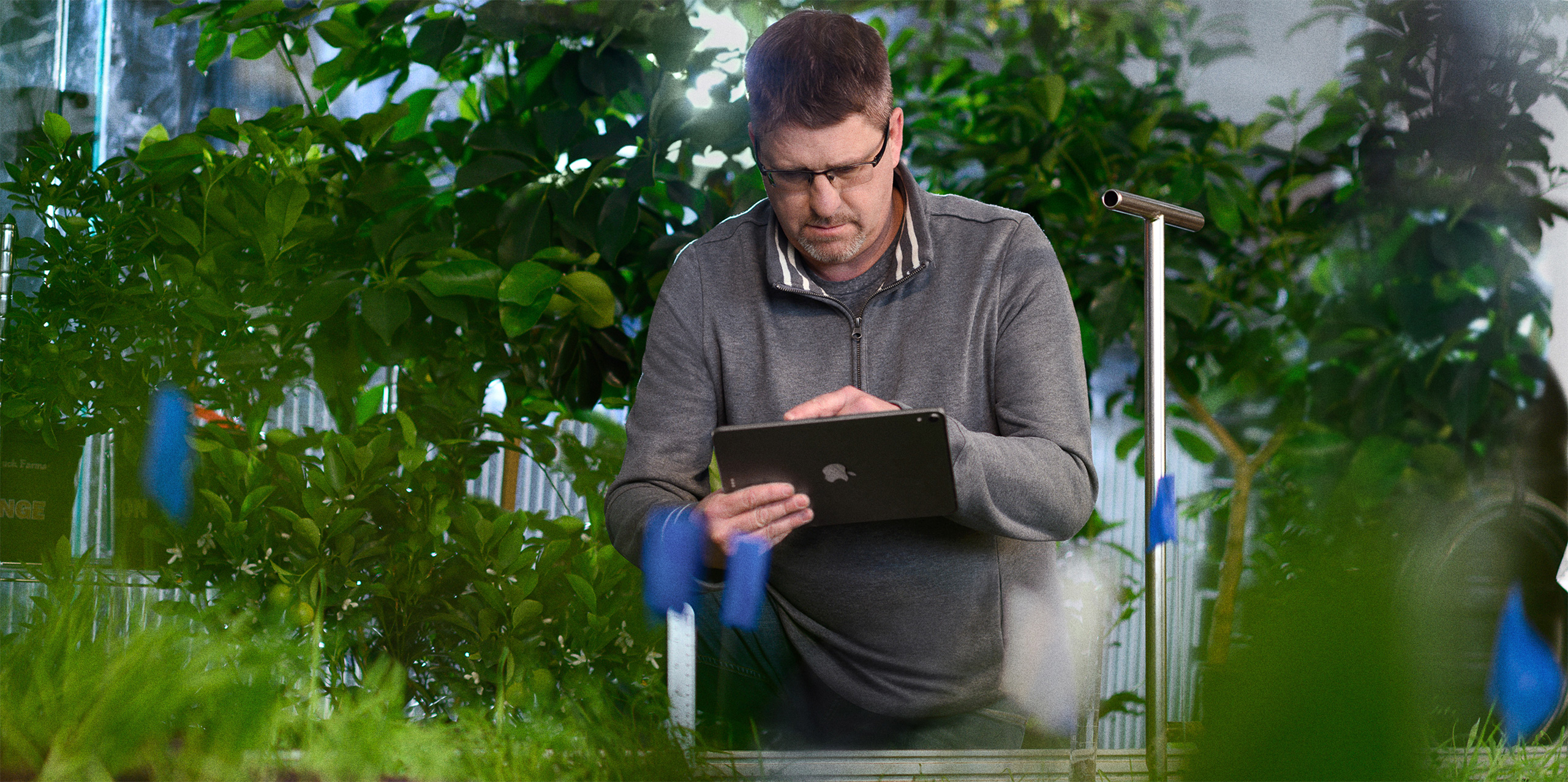 iPad Pro. Bergsma uses apps on iPad Pro like Climate FieldView to capture, monitor, and measure all of his agriculture research data — like water irrigation and crop nutrition — from seeding to harvest.
