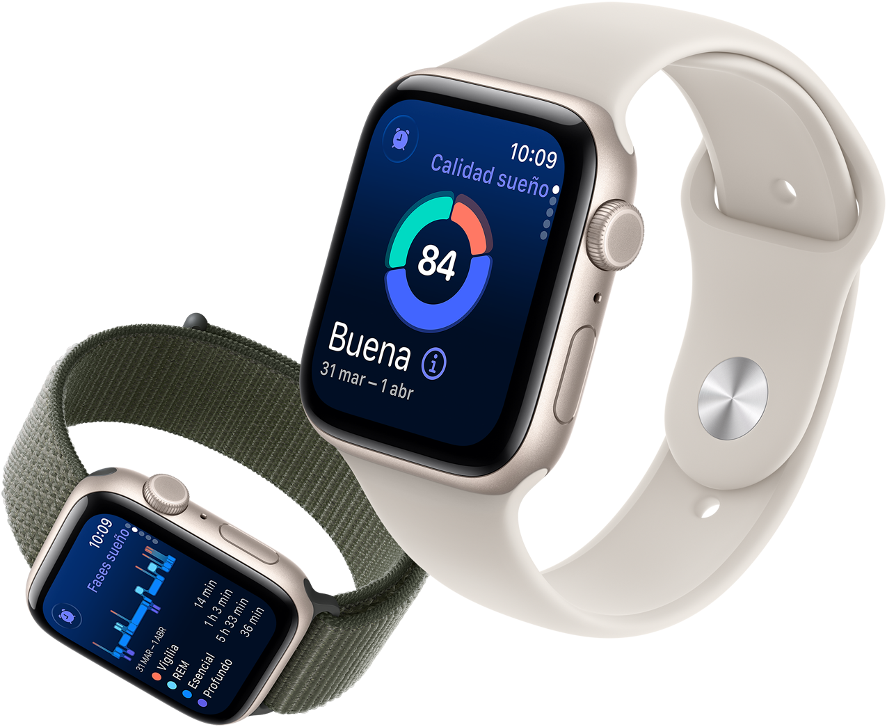 Modelos de Apple Watch SE 3, cajas de aluminio, color blanco estrella y medianoche, pantallas: app Constantes Vitales, app Frecuencia Cardiaca, Calidad del Sueño, anillos de Actividad, llamada entrante