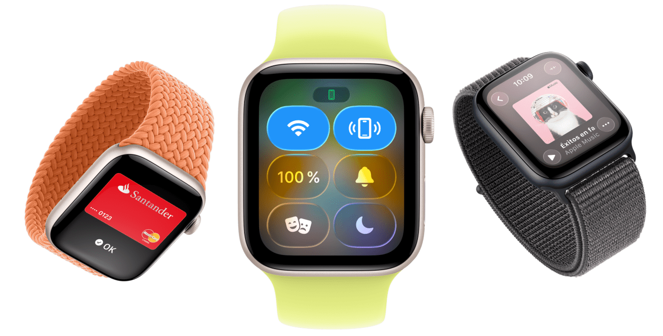 Dispositivos Apple Watch SE 3: caja de aluminio, color blanco estrella y medianoche, correa Solo Loop trenzada, color cúrcuma, correa Solo Loop, color amarillo neón, correa Loop deportiva, color gris oscuro, pantallas: Apple Pay, Centro de Control, Apple Music