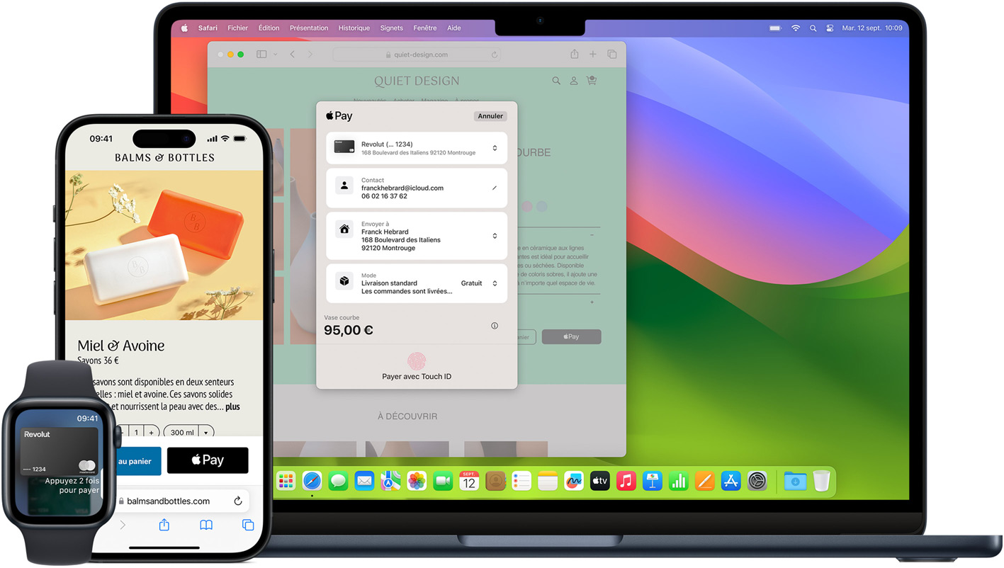 Un paiement Apple Pay est plus sécurisé qu’un paiement effectué à l’aide d’une carte bancaire ou prépayée traditionnelle. Pour toutes les transactions effectuées avec votre iPhone, Apple Watch, Mac ou iPad, vous devez vous authentifier avec Face ID, Touch ID ou votre code d’accès. Votre identité n’est pas communiquée aux commerces et le numéro de votre carte n’est pas visible. De plus, vos numéros de cartes ne sont jamais conservés sur les serveurs Apple.