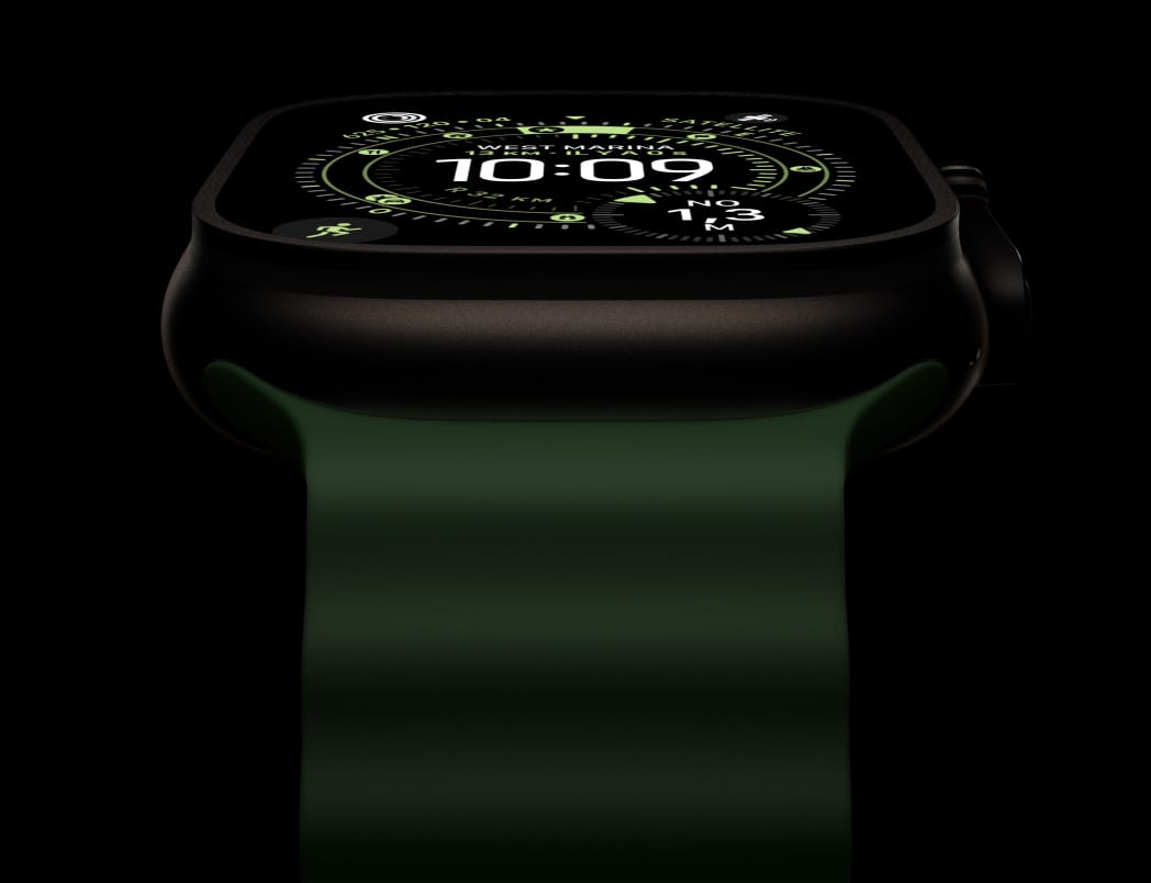 Apple Watch Ultra 3, boîtier en titane, finition naturelle, boussole sur le cadran Orientation, Bracelet Ocean, couleur vert fluo