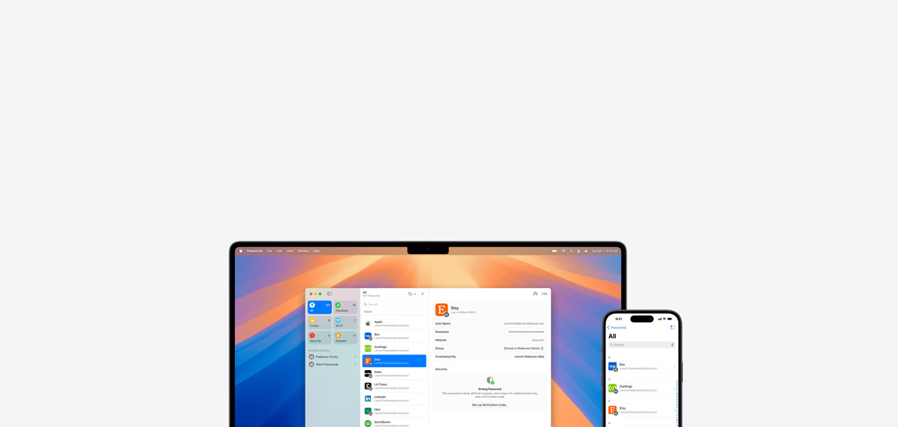 Avec l’app Mots de passe, les mots de passe de vos comptes ainsi que vos clés d’accès, mots de passe Wi‑Fi et codes de validation sont réunis au même endroit. Elle vous aide à gérer vos identifiants sur tous vos appareils via iCloud et vous prévient si un mot de passe n’est pas sécurisé. Vous pouvez créer, enregistrer et personnaliser des mots de passe robustes, les partager avec d’autres personnes et plus encore.