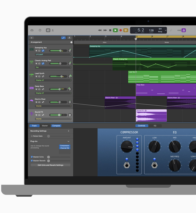 Produisez votre musique et peaufinez votre son grâce à des outils intelligents de création de rythmes, de composition et de remixage. À retrouver dans Apple Creator Studio.