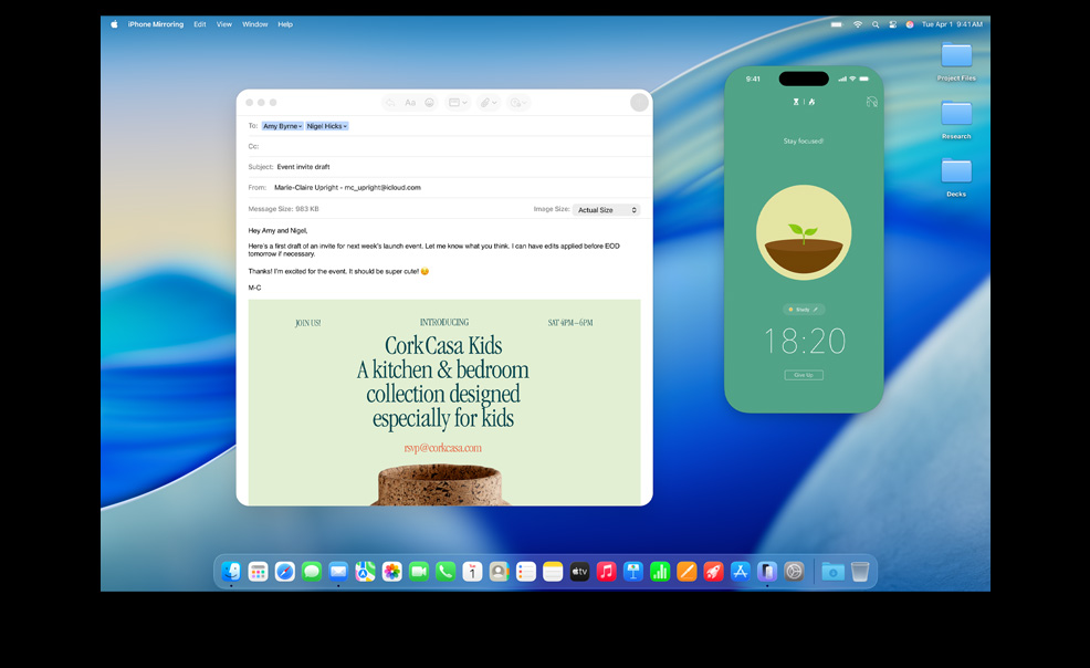 透過相機接續互通功能,你用 iPhone 拍攝的相片,可即時在你的 Mac 上電郵顯示出來;用 iPhone 掃描的收據,可直接在訊息 app 出現,並已自動裁剪和拉直,隨時都可分享出去。相機接續互通功能可與備忘錄、Pages 和 Keynote 等眾多 app 配合使用,令 iPhone 與 Mac 之間的合作,更合拍。相機接續互通功能更為視像通話解鎖不同新功能,例如當你使用 FaceTime 及 Zoom,可利用桌上視角功能,以俯視角度展示自己的工作空間;而在視像通話中,人物置中功能更會隨你移動,讓你時刻保持入鏡。