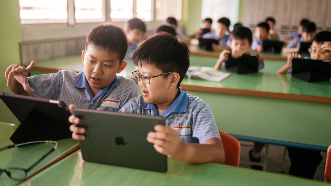 Terletak tepat di luar distrik bisnis Taipei, sekolah publik Zhiqing Municipal Elementary melayani lebih dari 700 siswa, mulai dari TK hingga kelas enam. Sekolah ini dipimpin oleh Kepala Sekolah Juiting Chang, yang meyakini bahwa teknologi meningkatkan keterampilan berpikir kritis serta kreativitas siswa — dan pembelajaran dengan iPad dapat membantu mereka bersaing di panggung global.