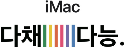 그린, 옐로, 오렌지, 핑크, 퍼플, 블루, 실버 등 다양한 색상의 iMac 7대가 아코디언을 닮은 배열로 펼쳐져 있는 모습