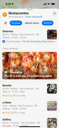 Al elegir un destino, la tarjeta interactiva te mostrará al instante todo lo que necesitas saber acerca del lugar, como la dirección, los horarios, el sitio web y el número de teléfono. También puedes consultar detalles como rangos de precios, fotos, métodos de pago aceptados e incluso si puedes llevar a tu perro. Con Flyover, puedes hacerte una idea de la ubicación y los alrededores. Incluso puedes rentar una bicicleta de forma rápida y segura, pagar el estacionamiento, pedir comida y mucho más con sólo un toque.