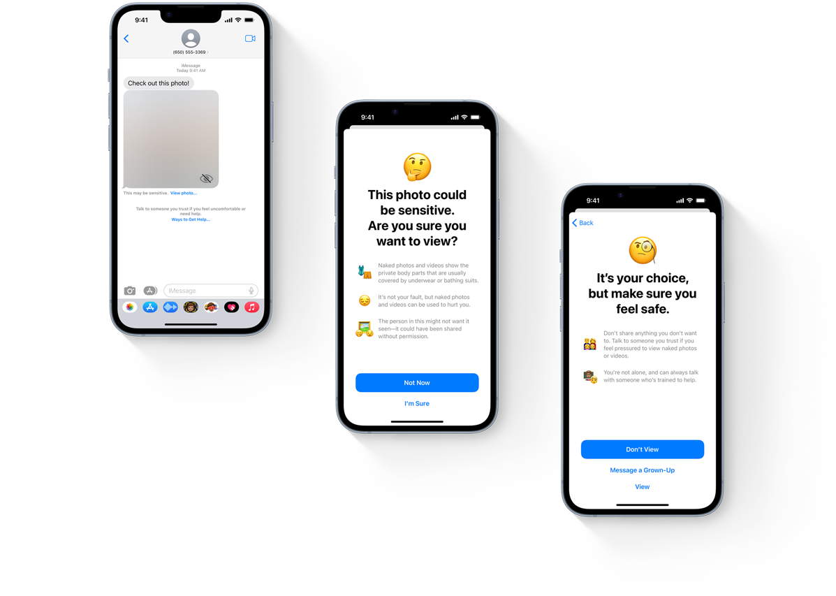 In de nieuwste versies van iOS, iPadOS en macOS kun je devices van kinderen zo instellen dat er een waarschuwing wordt weergegeven als ze afbeeldingen met naakt erin ontvangen of versturen. De afbeelding wordt geblurd en je kind ziet een waarschuwing, samen met handige informatie­bronnen en de optie om aan een vertrouwd persoon hulp te vragen. De end‑to‑end-encryptie blijft behouden en Apple heeft geen toegang tot je berichten.