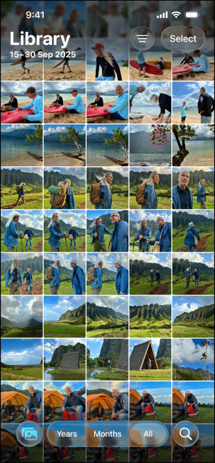 iPhone 17e, front exterior, showing many photos in Photos library