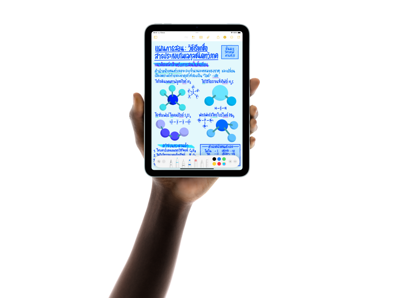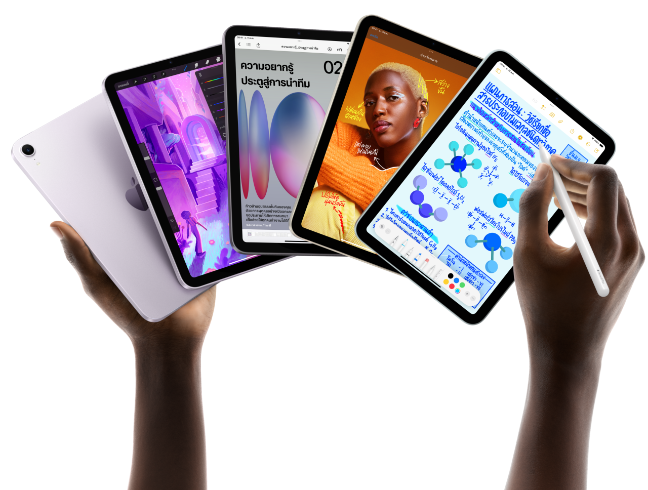 iPad mini ห้าเครื่องที่กางออกแบบพัดในมือของผู้ใช้ เครื่องหนึ่งแสดงกล้องหลัง ส่วนอีก 4 เครื่องหันด้านหน้าออก และมีการใช้ Apple Pencil Pro เพื่อจดโน้ต
