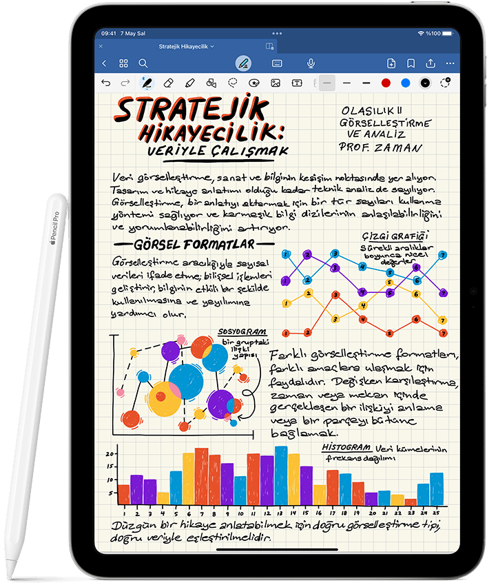 Solda dikey pozisyonda iPad, üstünde yapışık duran Apple Pencil USB-C ile yapılan bir çizim ve notların grafiği görülüyor.