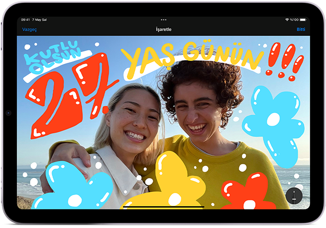 Mükemmel piksel hassasiyeti, düşük gecikme süresi ve eğime duyarlılık sunan Apple Pencil (USB-C), kurşun kalemle kağıda yazıyormuş hissi veren doğal ve duyarlı bir deneyim veriyor. İşaretleme, not alma ve daha pek çok şey için mükemmel. Seçiminizin önizlemesini görmek için Apple Pencil ile dokunmadan algılama özelliğini kullanabiliyorsunuz.1 Apple Pencil (USB-C), iPad’inize manyetik olarak yapışarak burada saklanabiliyor, USB-C ile eşleşiyor ve şarj oluyor.2