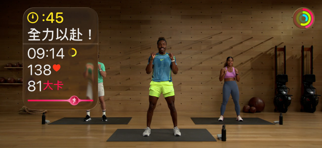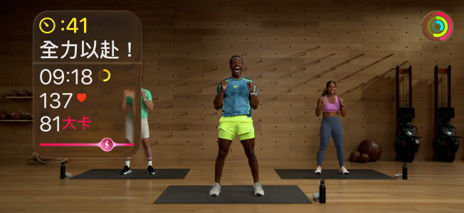 搭配 Apple Watch,讓你動起來超有感。體能訓練時,查看「活動記錄」圓圈的即時測量指標與進度,
