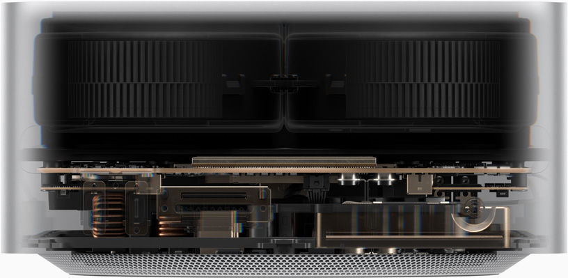 Within the 7.7-inch-square Mac Studio enclosure lies a thermal system designed to let M4 Max or M3 Ultra fly through intensive tasks at lightning-fast speeds. Even with so much incredible power, Mac Studio stays quiet, so it never interferes with your workflow.