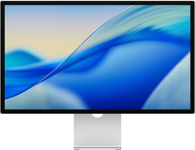 Front of Studio Display with colorful ribbon-like wallpaper Colorful ribbon-like objects fill the screen: zooming out, it’s revealed to be the wallpaper of Studio Display