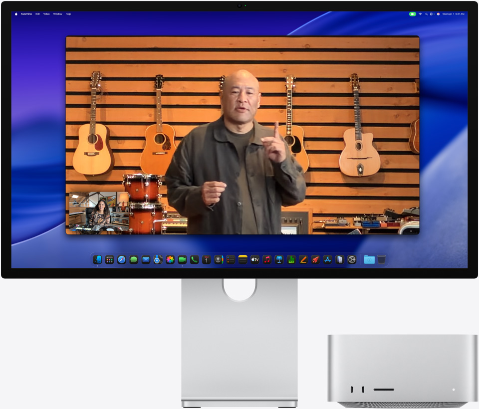 Studio Display XDR features a 12MP Center Stage camera with impressive image quality and low-light performance. Stay perfectly in frame during video calls, even as you move around or others join you. Desk View shows a top‑down view of your workspace while keeping you onscreen. And Edge Light illuminates your face by creating a virtual ring light around the edges of the display.
